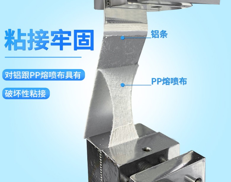 用于口罩鋁條粘無紡布等的粘接復合,通過一定的溫度壓力時間,對材料產(chǎn)生化學粘接,對鋁跟PP熔噴布有極佳的破壞性粘接性。具有流動性好,粘合強度高,無煙無氣味的特點